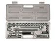 Изготовлен из хромованадиевой стали. Комплект 1 4: головки 4 - 13 мм (11 шт.), ключ-трещотка, удлинитель 75 мм, кард. шарнир, вороток, переходник