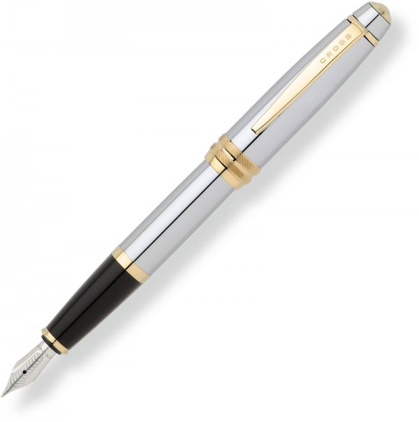 Перьевая ручка Cross Bailey. Корпус - латунь и хромированное покрытие. Отделка и детали дизайна - позолота 23К. Перо - сталь, среднее. Цвет - серебристый с золотистой отделкой.